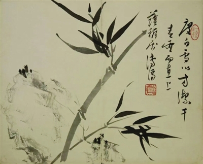 《裁云织锦》册之《竹石图》为1946年溥儒赴南京时为荫穉先生所作。画家取一石、二竹入画,竹依石而生,为典型的折枝式构图。淡墨枯笔勾皴表现山石,草木由浓墨点厾,干湿浓淡形成山石的虚实关系,苍茫松灵。山石前竹枝由淡墨湿笔行笔,笔断意连。竹叶以浓墨写之,枝节变化惟妙惟肖,生动自然。两株竹枝迎风不屈,犹如弯弓之弦,极富张力。竹子凌霜傲雪,无朝花夕瘁之态,象征着正直、清高。整幅作品用墨潇洒酣畅,富有动感。