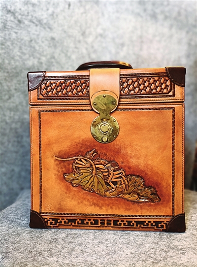 皮雕艺术作为我国传统工艺瑰宝,起源于距今4000多年的青铜时代。新疆五堡墓葬出土的轧涡旋纹革盒,上面刻有精美的涡旋纹,是距今发现最早的传统皮雕雏形。春秋《考工记》中记录了“攻皮之工:函人为甲”,先秦时的皮甲已绘有图案花纹。辽代时盛行“革囊盛乳”的皮囊壶,表面已有皮雕装饰。山西皮雕盛行于清末民初,大同最早,有皮箱、皮包、书箱、帽盒、脉枕、皮枕等。