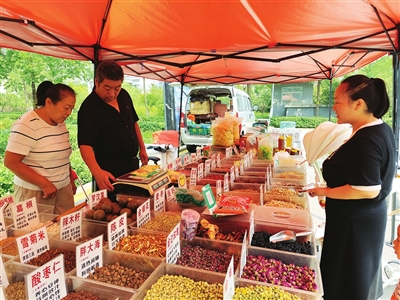 “蜂蜜没掺一点糖,早上天不亮就从村里往这儿送,保证原汁原味。”来自阳曲县的农户王大姐,一边给居民舀蜂蜜,一边笑着给自家产品做广告。“阳曲小米好,我吃过,来两斤。”居民陈大爷抓起一把小米,仔细看了看,非常中意。