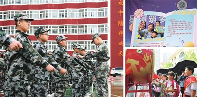 近日,我市中小学新生纷纷入学,开始了校园新生活。左图为8月28日,进山中学2025级初一新生冒雨踏上军训场;右上图为迎泽区建设路小学举行秋季迎新生活动;右下图为迎泽区山水城小学精心组织的开学活动。