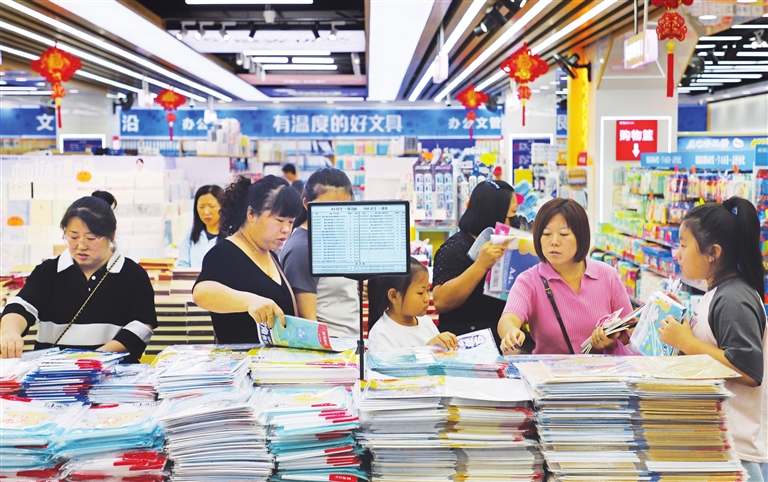 新学期即将开始,文具市场火热。图为8 月 31 日,尖草坪小商品批发市场二楼文具区内挤满了选购文具的学生和家长。