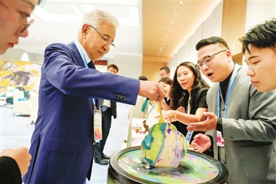 8月31日晚,贵宾们在欢迎宴会前体验制作漆扇。