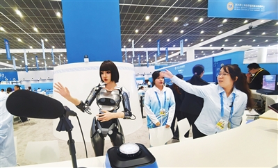 8月29日,在2025年上海合作组织峰会新闻中心的综合服务台,一名正在回答问题的工作人员动作恰巧与多模态交互型机器人“小合”同步。