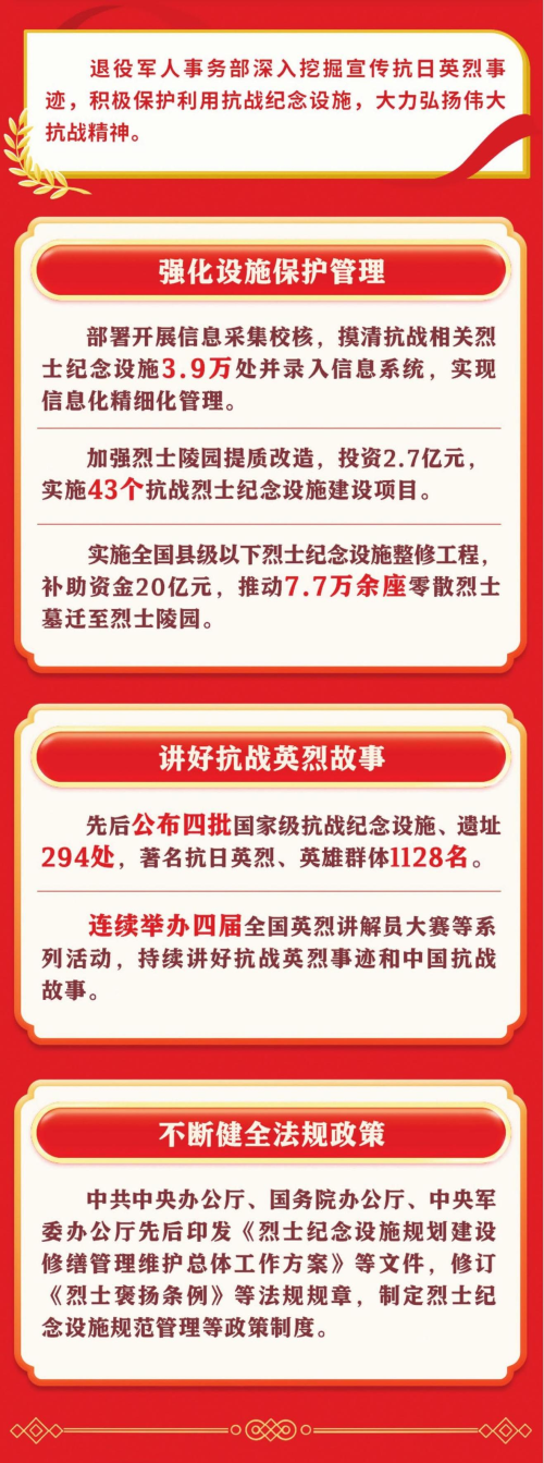 据介绍,退役军人事务部加强烈士陵园提质改造,投资2.7亿元,实施43个抗战烈士纪念设施建设项目;实施全国县级以下烈士纪念设施整修工程,补助资金20亿元,推动7.7万余座零散烈士墓迁至烈士陵园;部署开展信息采集校核,摸清抗战相关烈士纪念设施3.9万处并录入信息系统,实现信息化精细化管理。