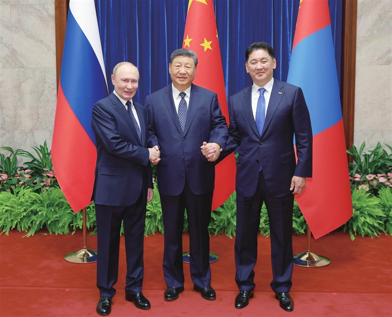 习近平指出,近年来,中俄蒙三方合作稳步发展,取得实实在在的成果。三方合作中期路线图顺利实施,三国贸易额节节攀升,经贸、科技、生态保护、人文合作不断深化。作为山水相连、休戚与共的友好邻邦,中方愿同俄方、蒙方一道,坚守合作初心,排除外部干扰,携手推动三方合作高质量发展。