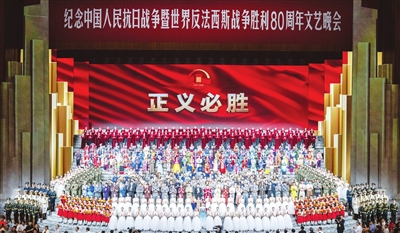 人民大会堂万人大礼堂灯火辉煌,二楼眺台悬挂着“铭记历史 缅怀先烈 珍爱和平 开创未来”的横幅。舞台正中,“正义必胜”4个金色大字熠熠生辉,庄严雄伟的长城造型象征着中华民族不屈的精神脊梁。