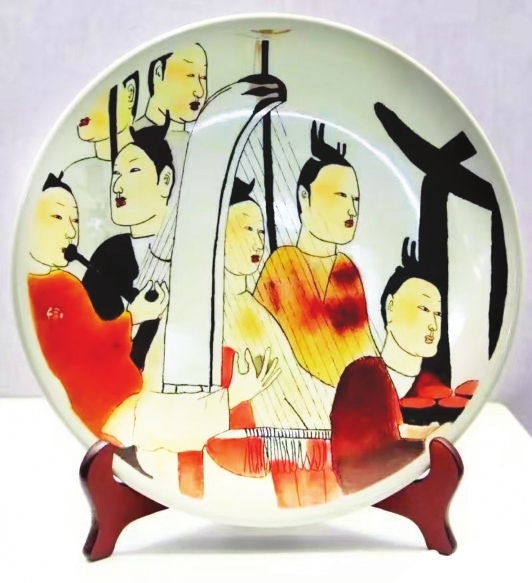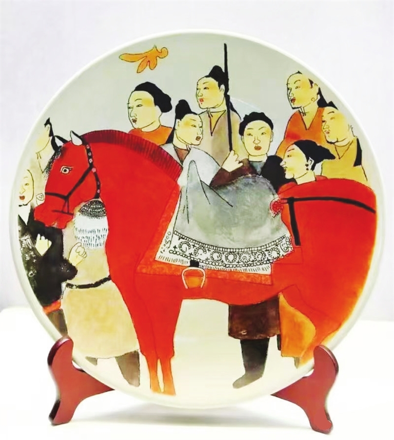 28年来,她刀锋未歇。为重现太原北齐墓壁画的千年神韵,苗振洁数度奔赴山东瓷厂,只为寻觅能精准承载古韵的瓷盘底色。面对瓷厂老师傅的不解,她却执拗地守着窑口试了一窑又一窑,直到瓷面泛出的柔光,恰好能衬出壁画历经岁月的温润。为了让壁画的古意不落俗套,她对着原作摹了又改,把“疏体”画的灵动融进刀工,袍角飞扬藏着刀锋流转,弦歌余韵凝于凿痕疏密,连眉梢笑意都被细密凿点收纳。当千年前的宴饮盛景被刻刀凿入瓷面,方知所谓传承,不过是借刻刀之力,把前人的呼吸,刻进当下的时光里。