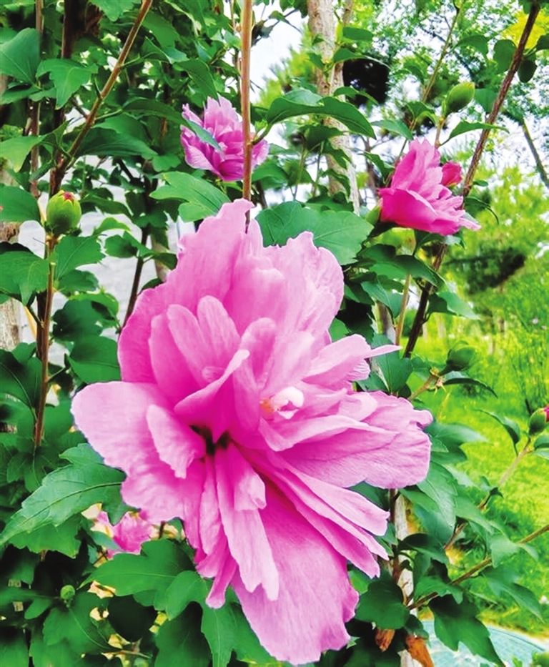 作为锦葵科木槿属落叶灌木或小乔木,木槿被广泛用于园林绿化或庭院绿化,多作草坪点缀使用,或独杆、或丛生,三五成群栽植。
