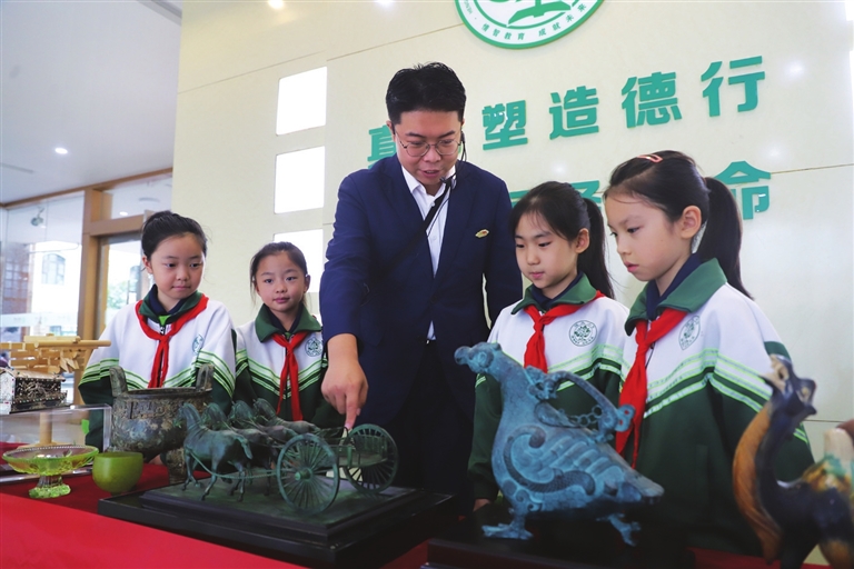 9月5日,太原市博物馆走进小店区恒大小学开展“锦绣太原历史文化”研学课程进校园活动。市博物馆讲解员带领孩子们参观展品,讲解互动,让学生们感知历史脉络,了解三晋文化。 张昊宇 赵心敏 摄影报道