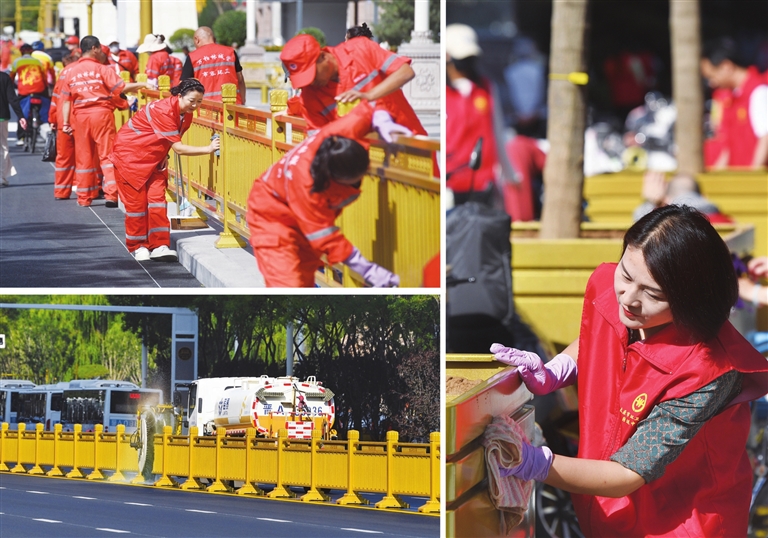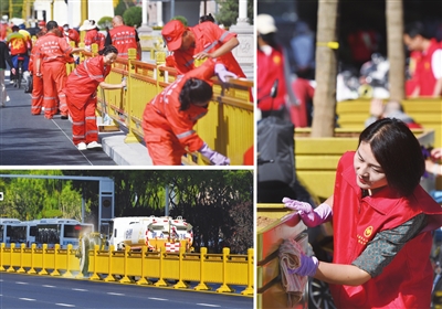 9月8日,迎泽大街西段改造工程现场,太原城管和万柏林区的志愿者们共同开展志愿服务活动,清洁公交车站、护栏等设施。 牛利敏 摄