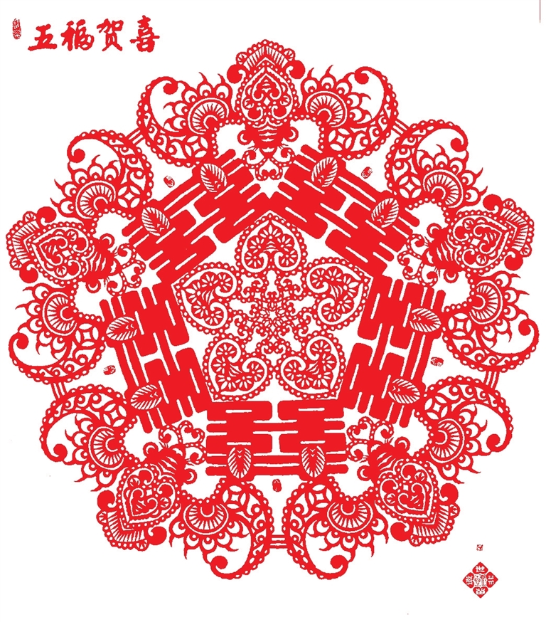 在武四新的工作室中,一幅名为《五福贺喜》的撕纸作品挂于墙上,长宽约50厘米,形制端庄、意蕴绵长。作品内圈,5枚如意纹婉转相连,以圆形、柳叶形、心形等镂空巧妙组合;中圈5只双喜字轻盈托举,每字上方皆缀有镂空一叶,似有生机浮动;外圈五蝠展翅,祥瑞环绕,尤其蝙蝠尾部连结处仅二三毫米,纤细如丝却不断不裂,线条灵动、刀意全无,全凭手撕而成,让人不禁拍案叫绝。该作品不仅工艺精湛,更曾荣获中国民间文艺的最高荣誉——“山花奖”。