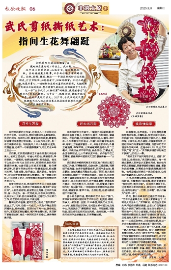 走进武四新的工作室,仿佛步入一个纸张幻化的艺术世界。目光所及,剪纸与撕纸作品琳琅满目,灵动的花鸟、传神的人物、寓意吉祥的图案,静静地诉说着民间最美好的祝愿。令人叹为观止的,是一件立体撕纸作品。轻轻展开,3只小鸟各据60度角,双翅舒展,仿佛下一秒就要振翅高飞,纸上的生命呼之欲出……