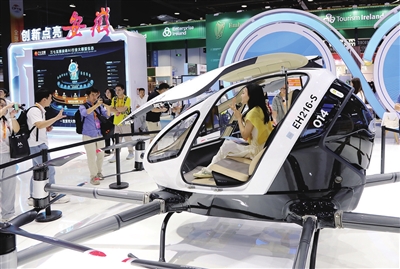 9月10日,在2025年服贸会主题展展区,一名媒体人员(右)在主宾省安徽省展台体验了解无人驾驶载人电动垂直起降航空器。