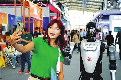 9月11日,参观者与机器人合影。