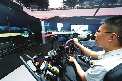 9月11日,参观者在体验六自由度赛车模拟器。