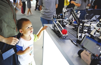 9月11日,在服贸会教育服务专题展区,一名小朋友在猿编程展台观看最新AI教育产品。