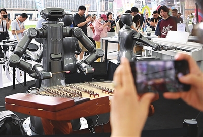 9月11日,在服贸会户外展区,参观者拍摄演奏乐器的机器人。