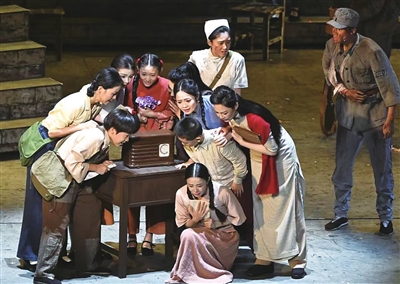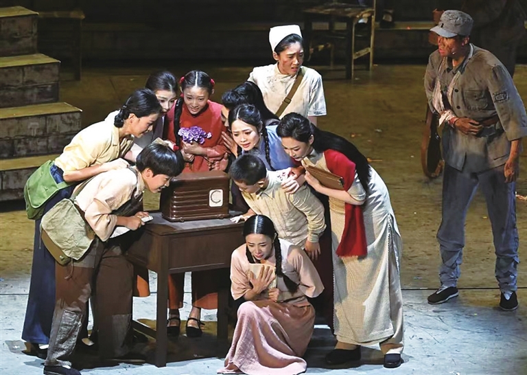在形式上,以历史脉络为轴,多元融合,层层递进诠释主题。晚会用开场、中间五场18个节目、尾声串联起了14年抗战史诗。通过情境表演、情境戏剧、情境演唱、情境对话、歌曲、舞蹈、朗诵与合唱等艺术形式,将历史时空、艺术时空、情感时空交织融合,让观众沉浸式体验那段波澜壮阔的历史。“情境+”模式贯穿始终。如情境表演《中华民族到了最危险的时候》中“松花江上”用戏剧化场景还原历史瞬间;情境歌舞《血染的白桦林》以歌舞结合剧情展现抗战中的悲壮与坚守;情境戏剧《永远的番号》通过角色演绎让部队番号背后的故事更具感染力,正如剧中刘老庄的大娘所说“莫欺我中华无肝胆,母亲膝下百万兵”,激励当代人传承和弘扬抗战精神,为实现中华民族的伟大复兴而不懈努力。