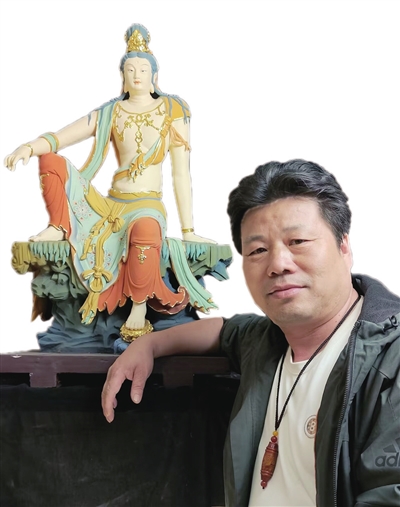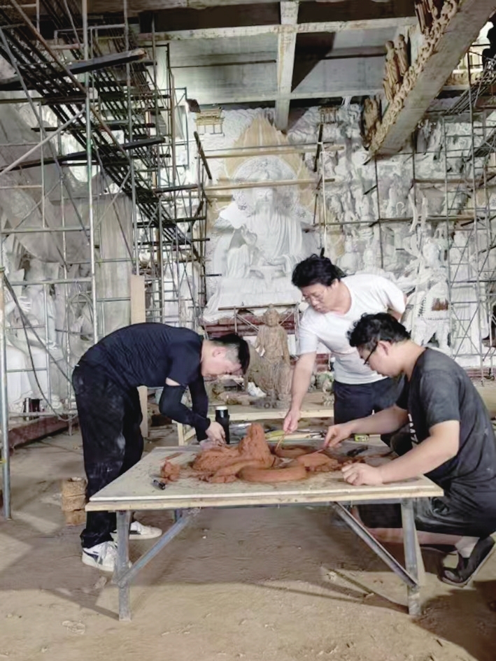 今年57岁的王亚军依然活跃在创作一线。在内蒙古广宁寺,他独创性地将严寒转化为工艺优势,运用传统冻干技法,精准实施“日塑夜冻”策略:利用短暂日暖微量上泥、精细塑形,再借昼夜温差实现渐进式自然定型。待次年春解冻后严格遵循“解冻禁动”原则,辅以骨胶水三重加固,历时整个冬季完成造像;在上海七宝教寺,为还原“海岛观音”的唐代风韵,他潜心研究南北艺术差异,以山西古寺观技法为基础,创新融合江南审美特质,经过三个月的反复推敲与实践,最终创作出获得南方专家一致赞誉的精品力作。“每一尊塑像都是新的挑战,”他说,“传统不是一成不变的,我们要在继承中创新。”