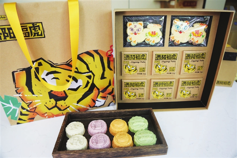 她巧妙利用3D打印技术自制模具,让龙山燃灯石塔、天龙山漫山阁等历史建筑的轮廓在月饼上栩栩如生。饼皮也别具一格,以晋祠大米为主料,融入天然蔬菜汁调色。今年,她推出的“晋阳福虎”和“晋阳风物”两款礼盒尤为引人注目。“晋阳福虎”以十三太保飞虎将军李存勖为灵感,将山神传说融入设计。抽拉式礼盒开启时,福虎图案跃然眼前,盒内配以仿珐琅冰箱贴和DIY贴纸,趣味盎然。“晋阳风物”则以晋阳西山五山九峪为主,搭配金属书签,层峦叠嶂,意境悠远。