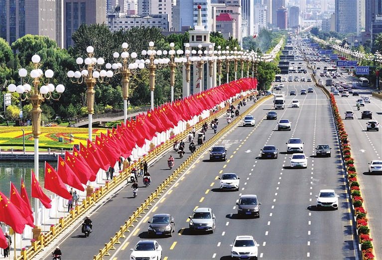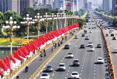 9月28日,迎泽大桥两侧一面面鲜艳的国旗迎风招展。 牛利敏 摄