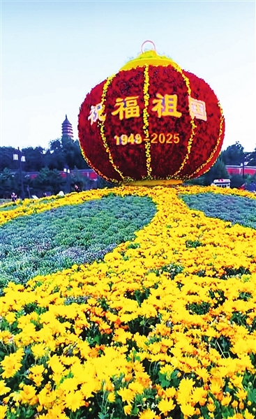 五一广场南广场,“标语花坛”以灯箱标语“热烈庆祝中华人民共和国成立76周年”为核心,辅以斜坡立体灯笼造型与地面流线型图纹,寓意着国家繁荣昌盛、人民安居乐业的美好愿景,传递出对伟大祖国最真挚的祝福;北广场的“欢度国庆”景观花坛,则以喜庆的花篮为主打,篮中各色花卉争奇斗艳,构成了一幅花团锦簇、生机盎然的画面,营造出浓厚的节日氛围,让过往市民和游客纷纷驻足观赏,拍照留念。