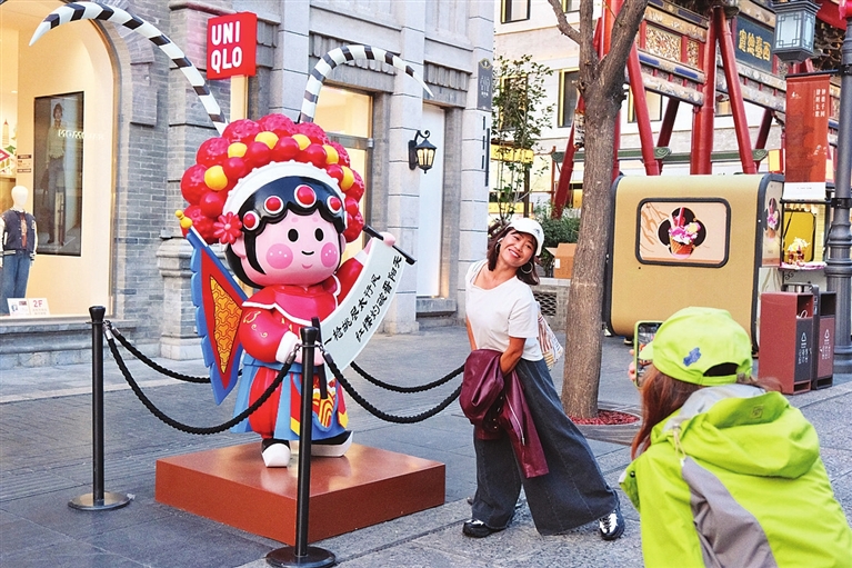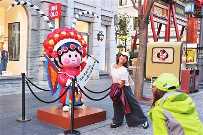 9月29日,游客在钟楼街戏曲人物造型前打卡拍照。钟楼街新设置了4个戏曲人物造型,宣传非遗。 王韵菲 摄