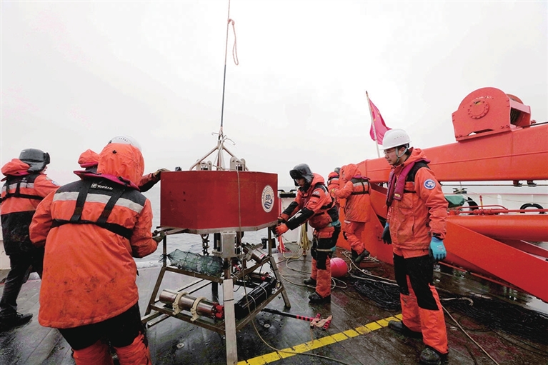 “雪龙2”号值班驾驶员祝鹏涛和胡天赐在Lander布放点附近停船后,任健在艉甲板打开释放设备,一旦搜到便按下释放键,Lander和连着的红色浮球就会浮出水面。