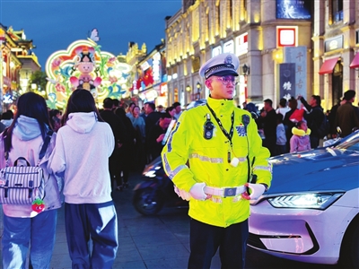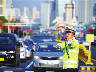 “师傅,欢迎来到太原,但迎泽大桥禁止停车,请您慢行通过或前往前方停车场,感谢配合!”10月5日,迎泽大桥两侧悬挂的数百面五星红旗迎风飘扬,与碧波荡漾的汾河美景交相辉映,游客们举着小国旗穿梭打卡,欢呼声、快门声此起彼伏。市公安局交警支队万柏林一大队三中队民警刘冬,一边用精准的手势疏导交通,一边向放缓车速的驾驶人耐心提醒。