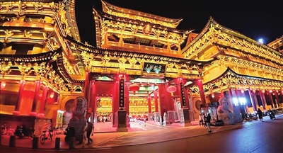 山西饭店曾是明清山西贡院旧址,当夜幕降临,饭店灯火辉煌,金碧辉煌的外观让人仿佛置身于一个梦幻世界。暖黄的灯带勾勒出飞檐斗拱的轮廓,金色琉璃顶在夜空中熠熠生辉,呈现出一种高调而奢华的美。现场,甚至有游客由衷地赞叹:“这简直就是太原的‘洪崖洞’啊!”