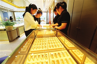 10月9日,在江苏省连云港市连云区一家黄金店,顾客在选购黄金饰品。