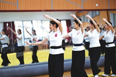 10月12日,浙江婺剧艺术研究院的演员在排练厅内练习基本功。