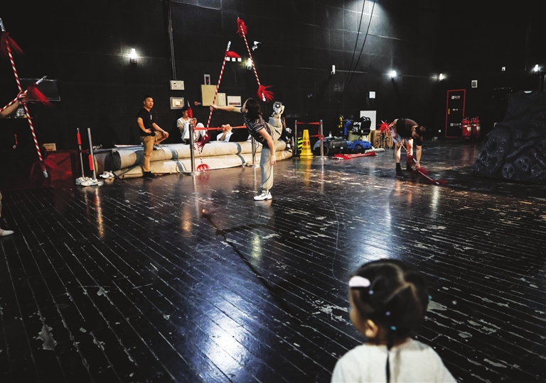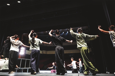 10月12日,浙江婺剧艺术研究院的演员在剧院后台练习基本功。