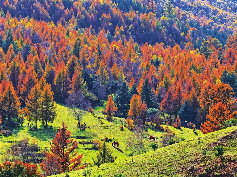 10月15日,秋色正浓的娄烦县云顶山,层林尽染,五彩斑斓,美景如画。 米国伟 耿婧媛 摄影报道
