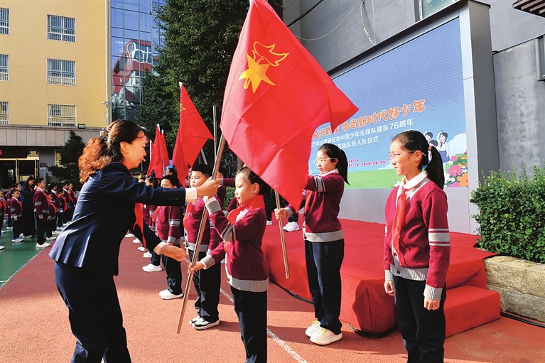 10月14日,为纪念中国少年先锋队建队76周年,太原市第二实验小学校举行了新队员入队仪式。一批朝气蓬勃的一年级同学在庄严的队旗下,光荣地加入了中国少年先锋队。 邓寅明 摄