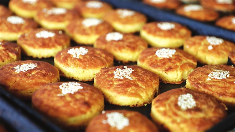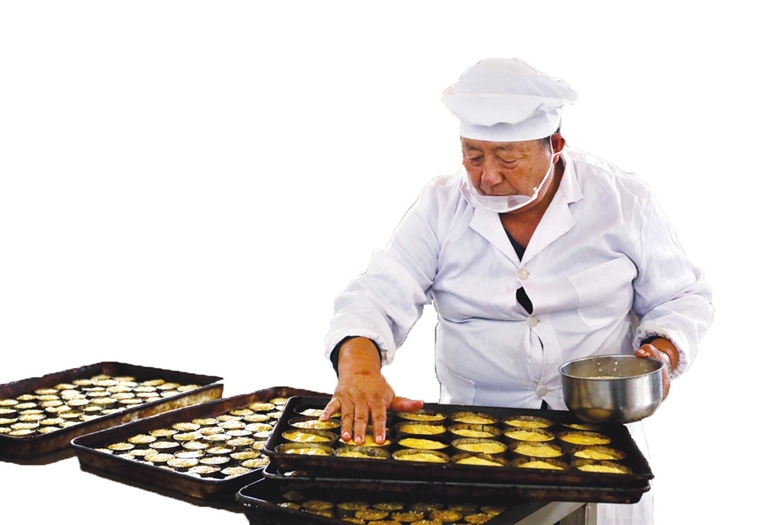最考验功夫的,还要数烘烤。“以前用老吊炉,全凭经验看火候,现在换了电烤箱,我把温度摸得更准了。”车四维说着掀开烤箱门,热浪裹着香气扑面而来——上火270℃锁住表面焦香,下火220℃慢烤内里酥软,15分钟一到,出炉的饼通体金黄,凉透后咬下一口,香、酥、软、甜、凉恰好平衡:甜而不腻,是绵白糖的温润;酥而不碎,是油酥层的韧劲;凉而不冷,是面粉本身的暖感,放在嘴里几乎不用嚼,便慢慢化开,余味里满是麦香。