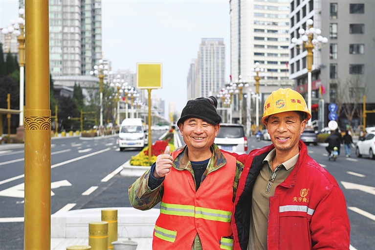 站在崭新的新建路上,来自四川眉山的建设者涂师傅和文师傅自豪地说:“瞧我们修的这条路多漂亮!”