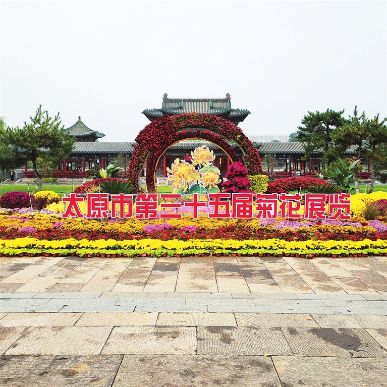 来到公园的中心广场,一座巨型灯笼造型的花坛瞬间吸引了众人的目光。灯笼上祝福祖国的字样格外醒目,这是对祖国最深情的祝福,也是对祖国辉煌历程的崇高敬意。下方的花坛,红、黄两色菊花交织成太阳花的图案,热烈而奔放。红菊花似晨曦中的朝霞,馥郁浮动,婀娜多姿;金黄色的菊花如金灿灿的阳光,铺满了整个花坛,温暖而明亮,给人带来无尽的希望与力量。红、橙、黄、紫各色菊花点缀其间,将五彩斑斓的菊花展现在我们眼前。抬头望去,永祚寺中的双塔高耸于花坛之中,将古晋阳八景之一的“双塔凌霄”与菊展完美融合,美不胜收!