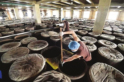 发酵过程中,“翻醅”是最考验功力的步骤。工人需将大缸底层醋醅翻到表层,确保上下温度均匀,温度必须控制在40摄氏度到45摄氏度之间。优质醋醅呈棕红色,捏起来松软不黏手,闻着有淡淡的酒香和酸香,这种手感和气味需十年八年的经验积累才能准确判断。