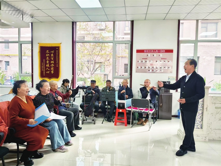 19日下午3时,社区党群服务中心一层大厅里歌声嘹亮,10余位老人合唱《我和我的祖国》《映山红》等熟悉的歌曲。社区工作人员侯梓萌过来值班,给老人们调试好音响,挨个倒满热水。