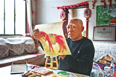 制作流程中,画稿是基础。将样品模板放在牛皮上,仔细勾勒出人物、布景的轮廓。画好后,用湿毛巾将皮子蒙住软化,待软硬适中时,便可开始最关键的镂刻工序。“雕刻最难,没个几年工夫练不出来。”王锁林说,为了满足不同的镂刻需求,他自己制作了十几把刻刀,有斜口刀、三角刀、花口刀等。说着,王锁林拿出刻刀,将牛皮平放在蜡版上,一点一点雕刻起来。