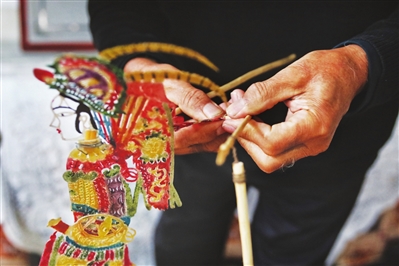 镂刻完成后,便是敷彩。色彩搭配讲究鲜明生动,既能凸显人物性格,又能在灯光下呈现出极佳的视觉效果。上色后还要熨烫平整,最后将皮影的头、臂、手、上身、臀部、腿部等部件组装起来。