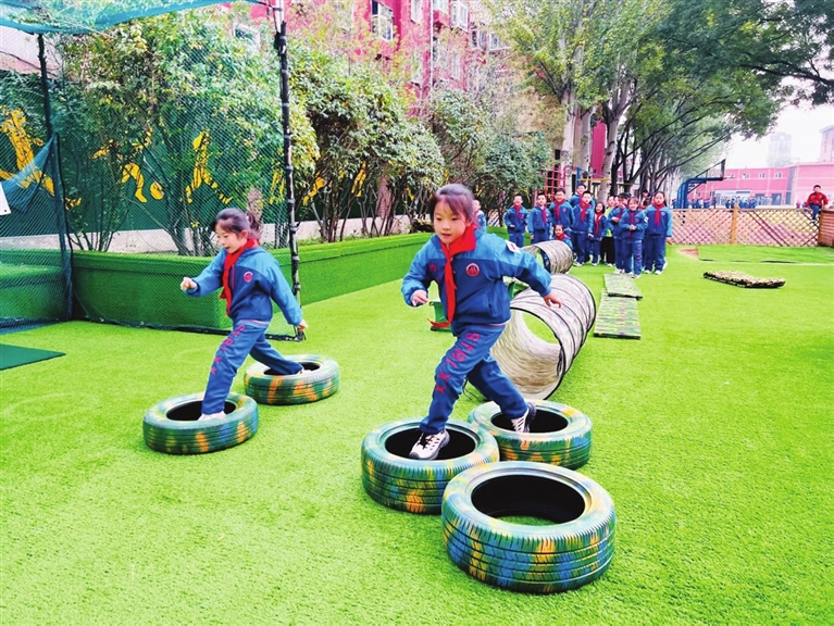 活动中,学生们身着统一运动校服,在老师指导下,有序挑战战术匍匐与团队障碍赛,在铺设了模拟草地的匍匐区,他们压低身体、屈肘撑地,交替向前移动,衣角沾了泥土也毫不在意。障碍赛环节,孩子们两两一组,相互提醒“踩稳木板”,在跨越矮墙、平衡木的配合中,欢呼声与加油声此起彼伏。孩子们也在“听从指令”“团队协作”的实践中,体会到纪律意识与集体荣誉感。学生们说:“比起跑步和跳绳,爬障碍、练队列更有意思,还知道了做事要听指挥、跟同学配合才能更快完成任务”。上课的老师也表示,将体育活动课与军事体验结合,是为了打破单一运动模式,让学生在“玩中学、练中强”,既落实体育锻炼目标,也为学生成长注入勇敢、坚毅的力量。