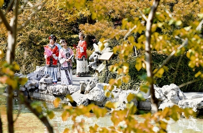 重阳节来临之际,10月28日,在秋景如画的晋商博物院里,老人们结伴游玩拍照,乐享重阳。 邓寅明 摄