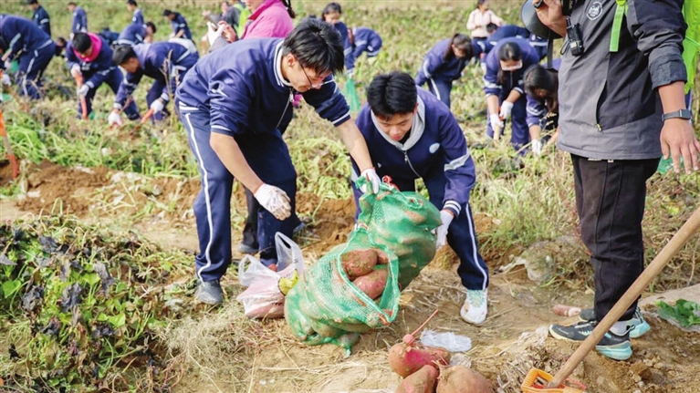 田垄间作物长势旺盛,有的果实缀在枝丫间,有的藏在藤蔓下,还有的埋在松软的土壤中,连片的绿意里缀满各色果实,尽显秋日丰收盛景。在基地老师的讲解与示范下,学生们快速掌握了采摘、清理的基础技巧,随后分组行动,秋收劳作正式展开。田间地头里,学生们投入劳动,采收作物,挑选装袋,清理田间杂物与枯黄藤蔓,看到伙伴搬运重物吃力便及时伸手搭帮,协作的身影穿梭在田间。从动作生疏到逐渐熟练,同学们始终相互协作,心中满是对劳动的投入与对收获的喜悦。