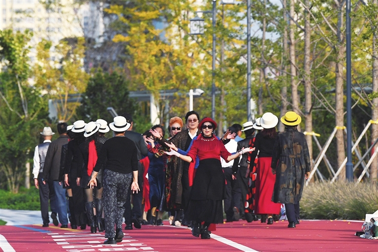 10月29日,重阳节,兴华街一处游园内,老人们踏着轻盈步伐,在落叶缤纷之中一展银龄风采。 邓寅明 摄