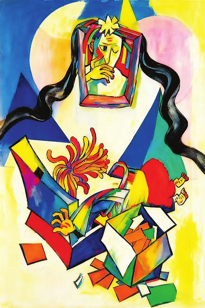 《色彩下的人性悲歌》以极具冲击力的色彩与夸张变形的构图,讽刺了子女在老人刚过世就急于搜刮钱财的冷漠与贪婪。色彩的强烈冲击:画面运用了大量高饱和度的色彩,如明艳的黄、热烈的红、深沉的蓝等,这些色彩相互碰撞、交织,营造出一种看似喧嚣热闹,实则充满躁动与不安的氛围。色彩的混乱对应着人物内心的贪婪与无序。构图的夸张变形:画中人物被夸张变形,下方翻箱倒柜的子女肢体扭曲,动作显得急切而疯狂,生动地展现出他们在搜寻存折时的迫不及待。破碎的几何形状四散开来,如同破碎的亲情。符号的深刻隐喻:上方的人物形象是情感与回忆的象征,代表着曾经的亲情纽带;而散落的箱子、纸张等则象征着物质财富。画家用这种极具象征意义的表现手法,揭示了一些人被金钱蒙蔽了双眼,丧失了基本的亲情与道德底线,引发观者对人性、亲情和金钱关系的深刻反思。