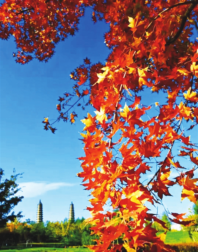 进入11月,双塔公园的五角枫,悄然褪去盛夏的翠绿,叶片由浅黄渐染成艳红,似火焰跳跃在枝头,将千年双塔的古朴与秋的热烈完美交融。