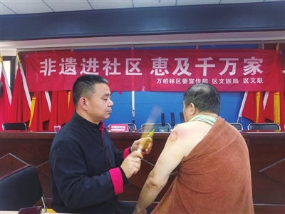 “清代编撰的医学丛书《医宗金鉴》,首次明确记载了这种拍打疗法。”出身中医世家的蔚俊康说,《医宗金鉴》称之为“振梃疗法”,“振即振动拍打,梃即木棒也……用此梃微微振击其上下四旁,使气血流通,得以四散,则疼痛减轻,肿硬见消也。”