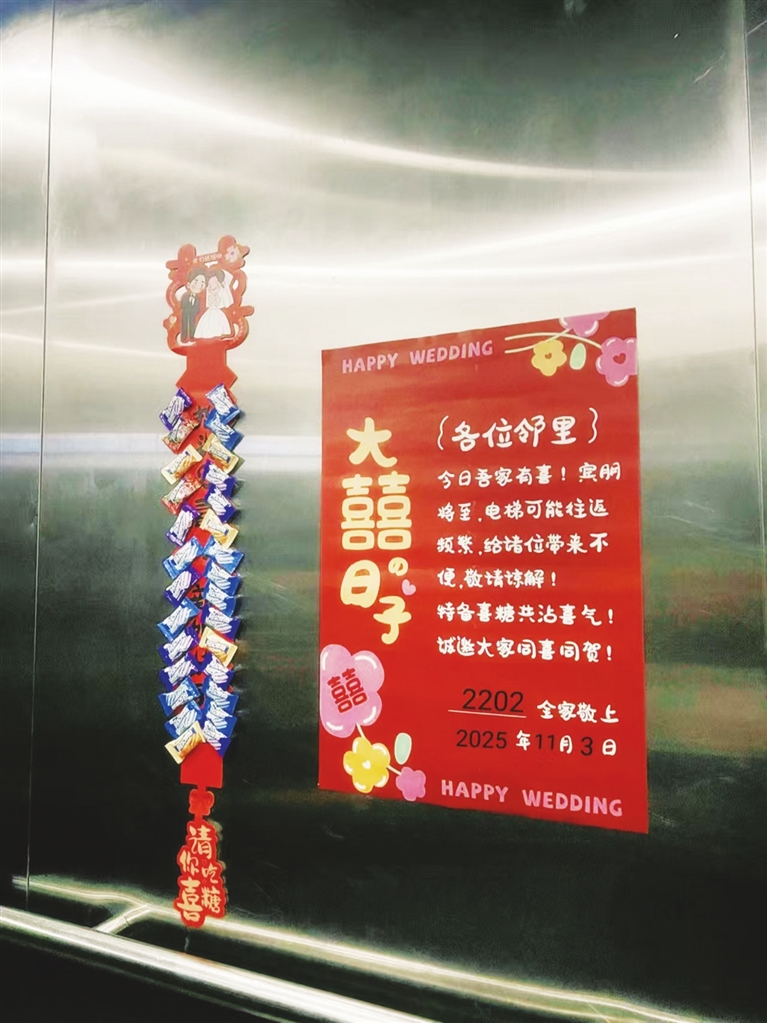 家住十二院城小区的王先生将举办婚礼,考虑到婚车会临时占用楼下区域,还会频繁使用电梯,他提前在居民群里留言,向大家说一声“抱歉”。而且,他在电梯内张贴了红彤彤的喜报,上面写着:“各位邻里,今日吾家有喜。宾朋将至,电梯可能往返频繁,给诸位带来不便,敬请谅解!特备喜糖共沾喜气。”旁边,挂了一串喜糖。